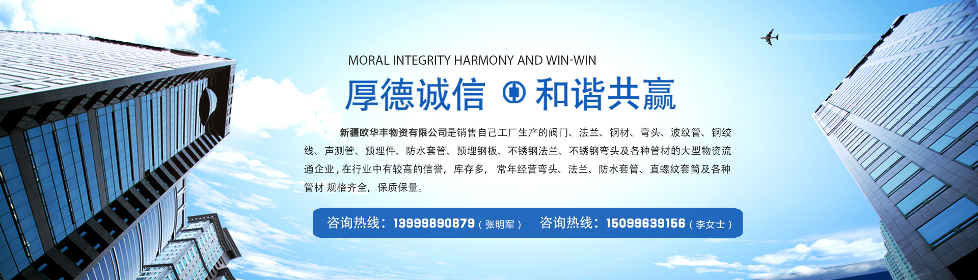 新疆歐華豐物資有限公司是銷售自己工廠生產(chǎn)的彎頭  法蘭  防水套管  及各種管材的大型物資流通企業(yè) , 在行業(yè)中有較高的信譽,庫存多,常年經(jīng)營閥門、法蘭、鋼材、彎頭、波紋管、鋼絞線、聲測管、預埋件、防水套管、預埋鋼板、不銹鋼法蘭、不銹鋼彎頭及各種管材 規(guī)格齊全,保質(zhì)保量。 公司一貫以: 服務(wù)上乘、質(zhì)量優(yōu)質(zhì)、價格合理、客戶至上、服務(wù)周到、讓利客戶、薄利多銷為原則,誠實守...